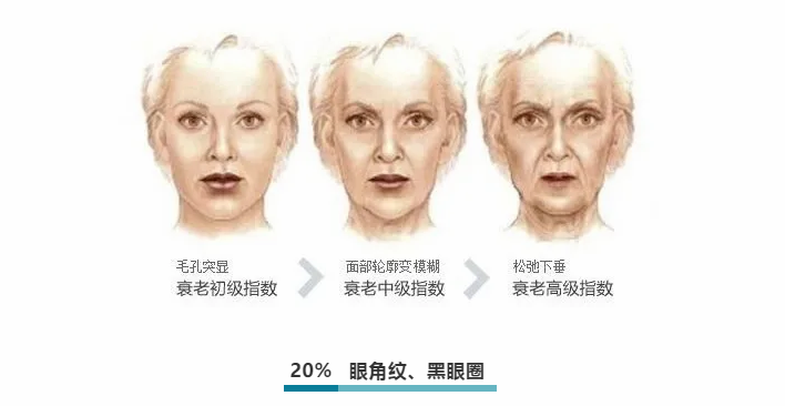 一般从25岁开始,人体就进入了衰老阶段。脸部的衰老,首先就是眼周的衰老。眼周松弛,出现细纹,毛孔粗大,有较淡的色斑,熬夜后更容易出现黑眼圈,且不易恢复。