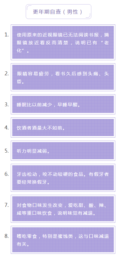 面对更年期,不少女士都感到恐惧,怕自己变得喜怒无常、情绪烦躁。其实,人到中年,不少男性也会出现“更年期”状况,大家都需要关心与理解。你是否怀疑自己正处于更年期?不妨看看自查表: