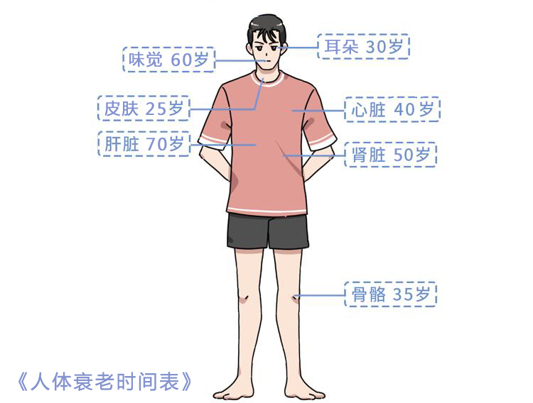 骨骼的老化要比想象中来得更早一些:35岁。这时人体骨细胞的损耗加快,骨骼更加脆弱,需要注意补充钙质。