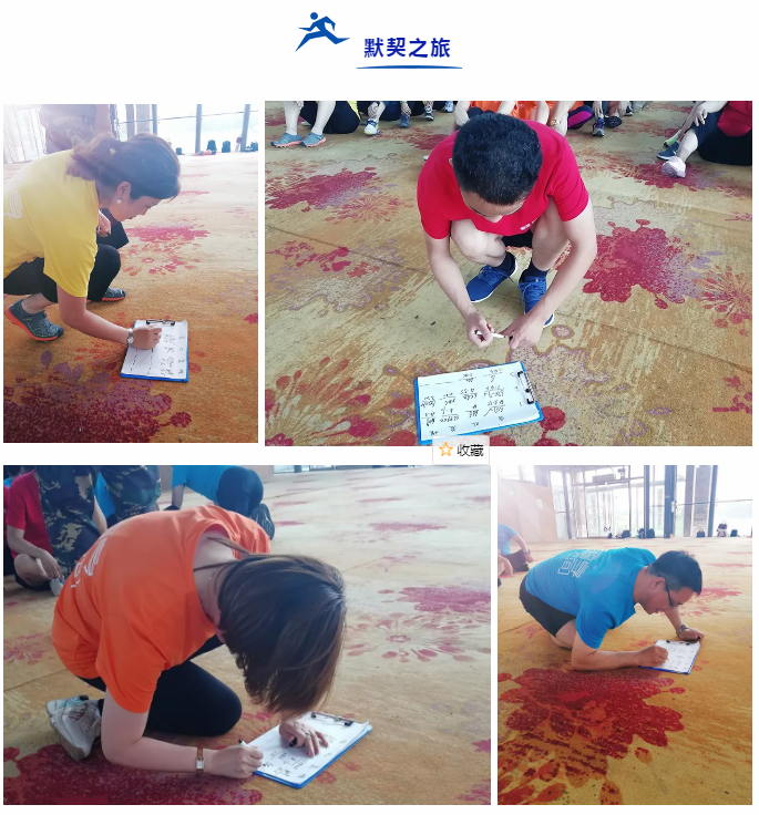 一队人排排坐,禁止眼神交流或说话,用背部的感受来传递信息,看似简单的小游戏却玩出了五花八门的答案,引得大家哄堂大笑,瞬间忘记了上午训练的乏累。