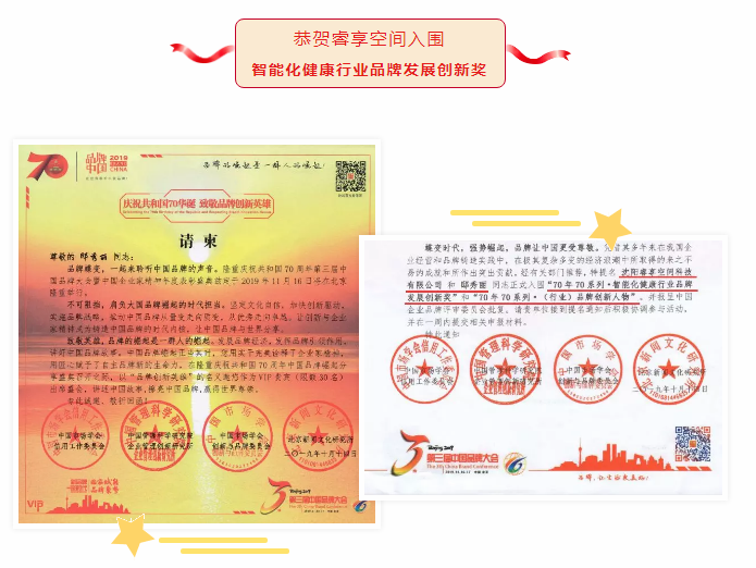 睿享空间经过多年的不懈努力,现已成为智能化健康行业的佼佼者,拥有自主知识产权15余项,完成品牌商标注册20余项,并于2018荣获《中国产品质量过硬信誉保证放心品牌》、《中国自主创新最具影响力品牌》《中国健康美容美体行业十大名优品牌》等荣誉称号。