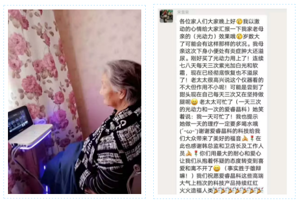 母亲坚持每日三次光动力的LED光疗与一次管理仪的健康管理,同时搭配使用软霜,很快改善了下身的炎症状况。做起管理来,老人家更有动力,女儿内心充满感激。