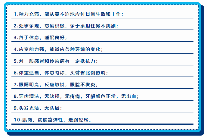 世界卫生组织公布10项健康指标,从身体状况、精神状态方面规定了健康标准: