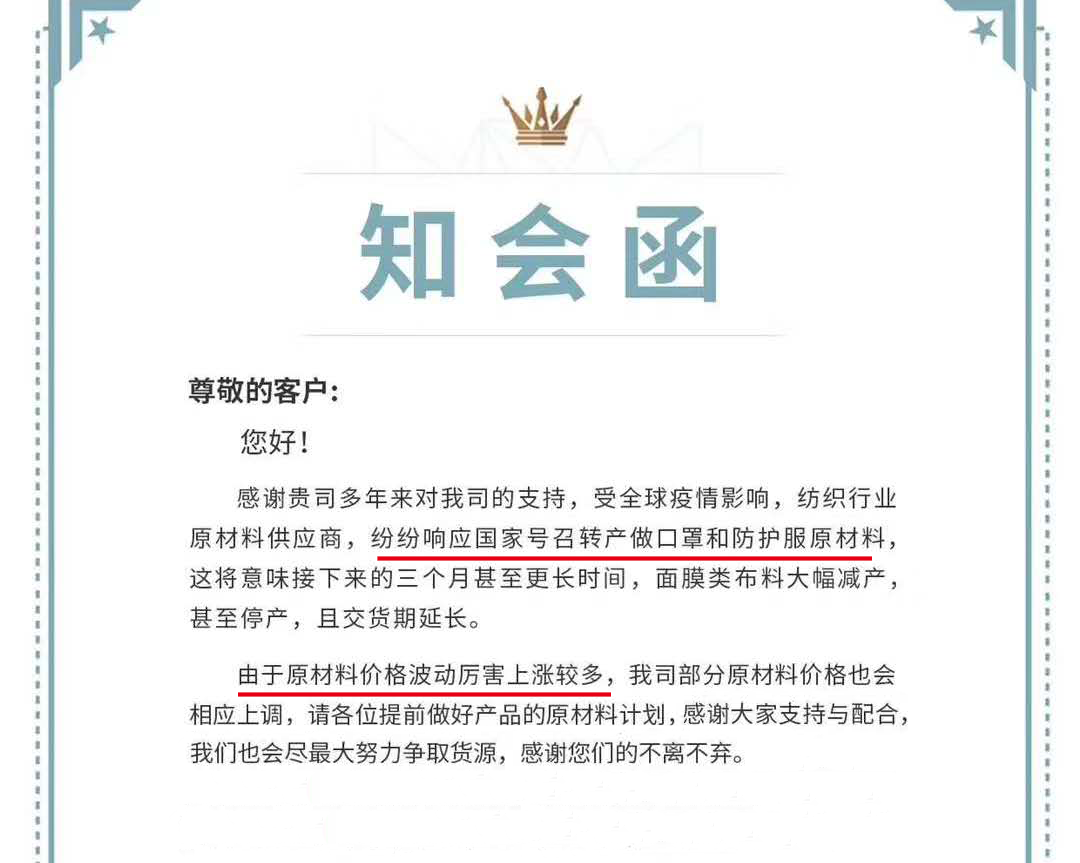 近日,公司收到了来自膜布原材料厂家的一封【知会函】。爱睿晶科面膜的膜布果然如此优秀,在对口罩质量严格把关的疫情期间,被优选为口罩和防护服原材料,再次为我们优秀的膜布点赞![]()