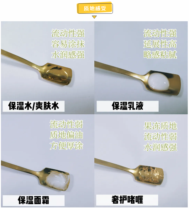 乳液:乳液的质地较粘稠,流动性虽不如水,却也OK。延展性高,属于比较容易涂抹的一类。