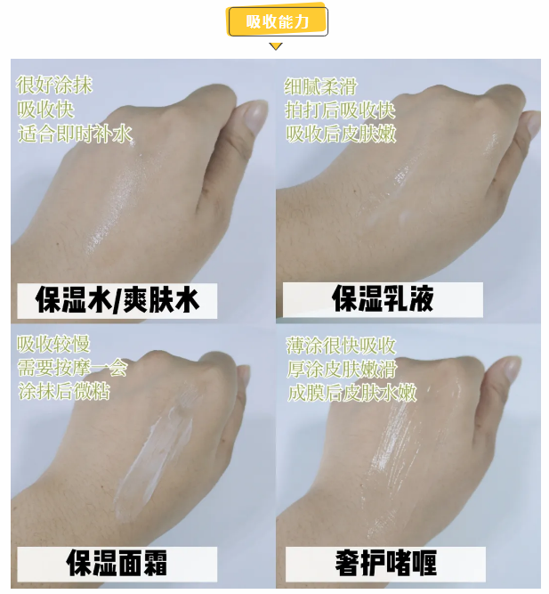 面霜:吸收较慢。少量涂抹,绕圈按摩后方可被皮肤吸收。
