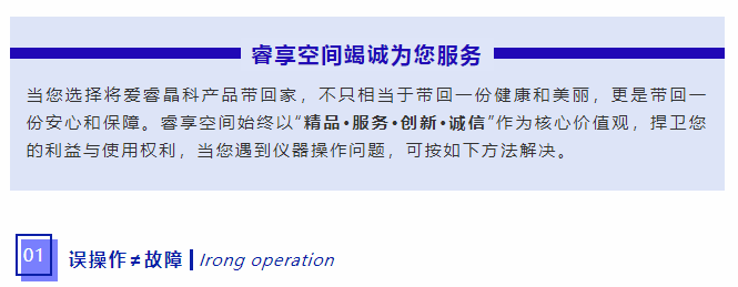 爱睿晶科系列产品,均有着严格的生产标准和检验流程。仪器出厂前、销售前均会有专业人员进行操作试验。所以,当我们在使用过程中遇到意外情况,可以阅读《使用说明书》中的「申请维修前确认事项」,查看是否是因误操作而造成的仪器不正常工作,及时解决您的烦恼。例如: