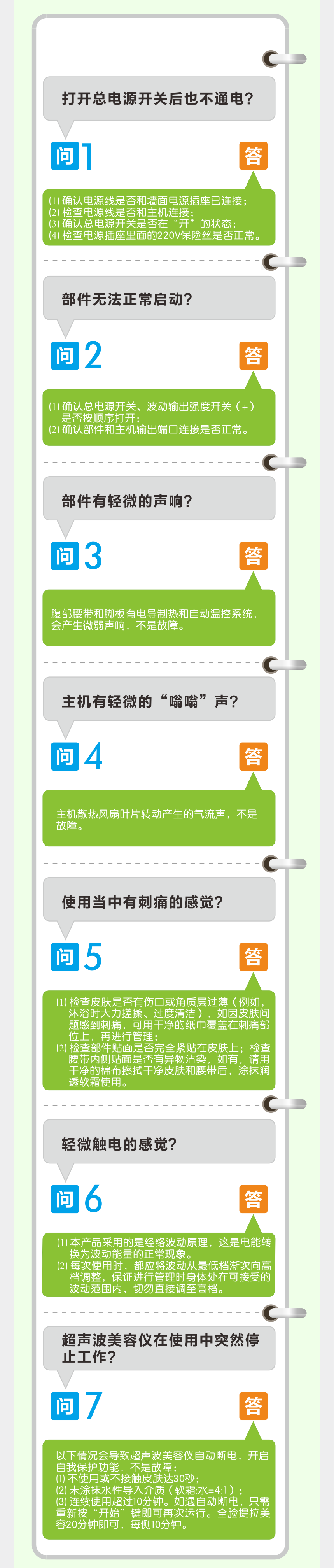 如遇部件不工作,您可以先排查是否存在以下误操作:①4P线/8P线与主机未连接或接触不良;②部件与皮肤接触不良,应使用绑带;③波动强度按钮未打开,等等。