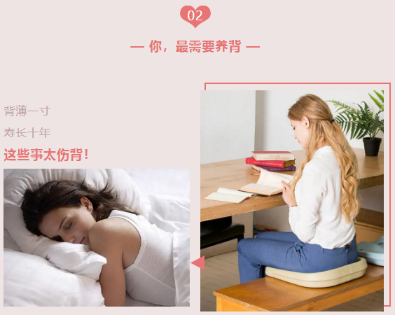 睡姿对背部的健康也很重要。人一天1/3的时间都花在睡眠上,如果睡觉时脊椎不能处在一个正常的生理状态中,很容易导致脊柱弯曲或错位,影响气血的正常运行。